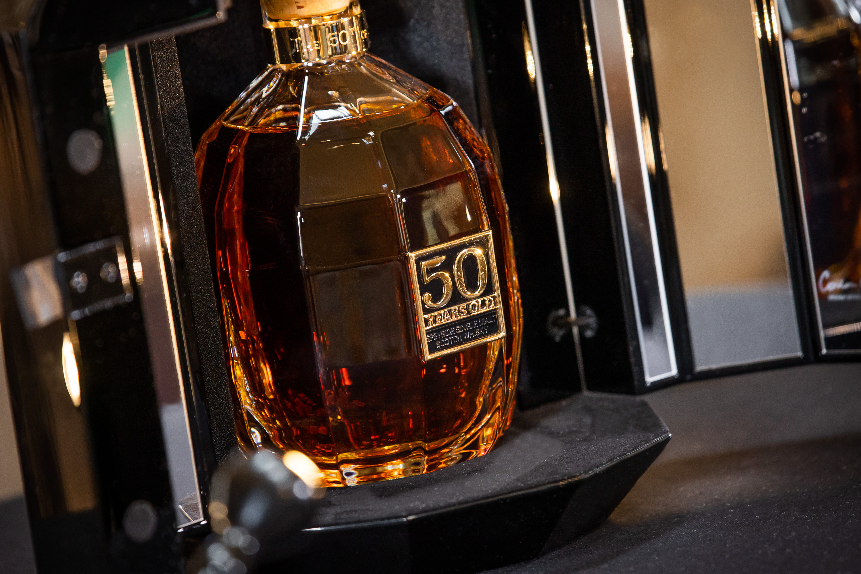 An engraved Scottish Gold collar with “The 50TH of 50” encircles the neck with the stopper featuring hand-cut letters and numerals proudly declaring “Bottle No. 50”.